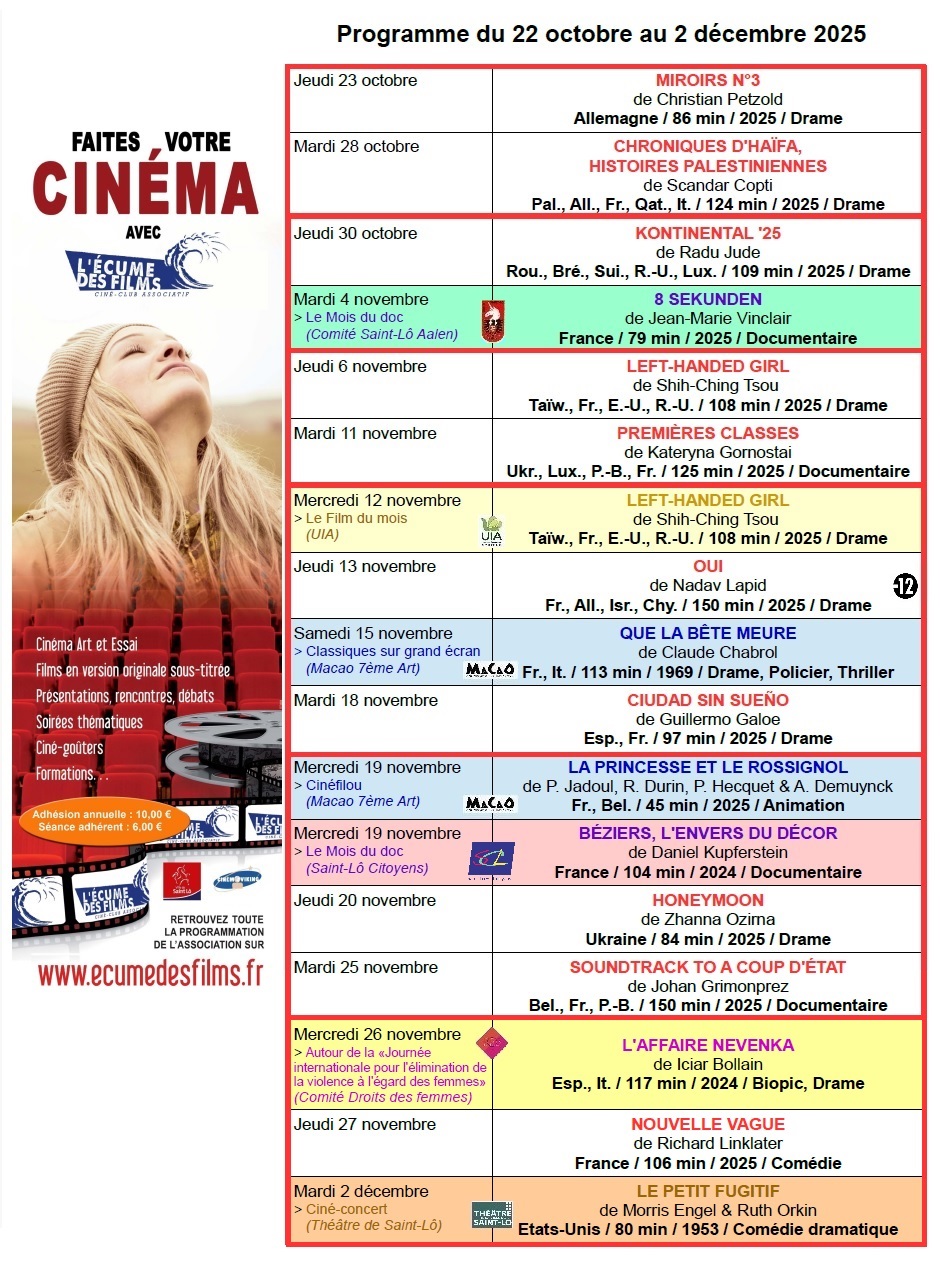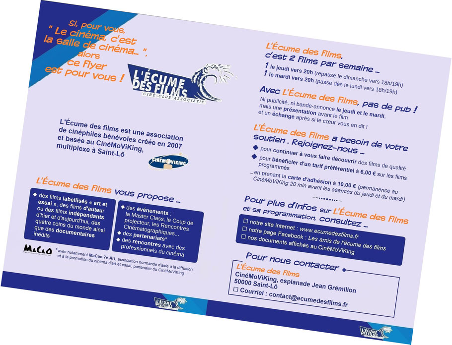 Vous pouvez trouver notre FLYER dans différents lieux de Saint-Lô, notamment le CinéMoViKing, la Médiathèque La Source, le Théâtre, l'Office du tourisme, les Centres sociaux Mandela et Mersier... ainsi qu'à la Médiathèque d'Agneaux.